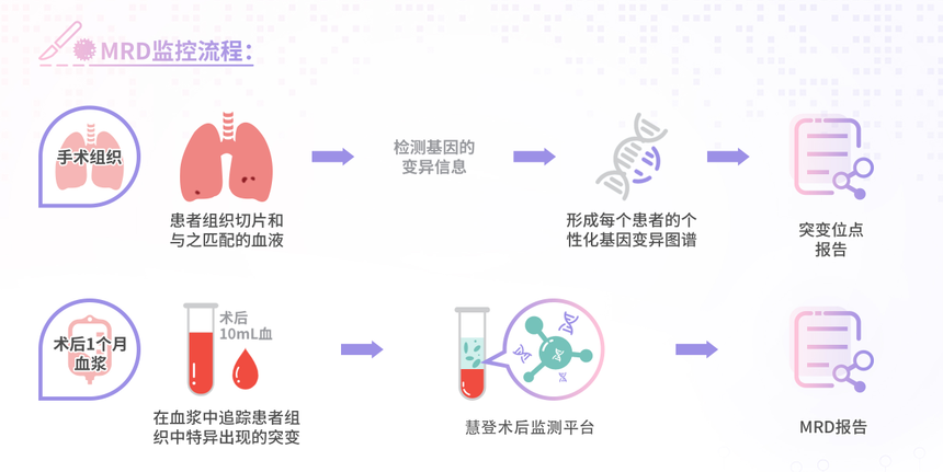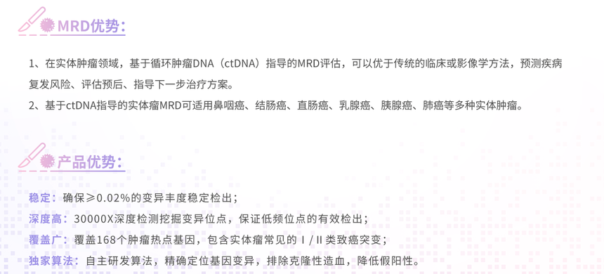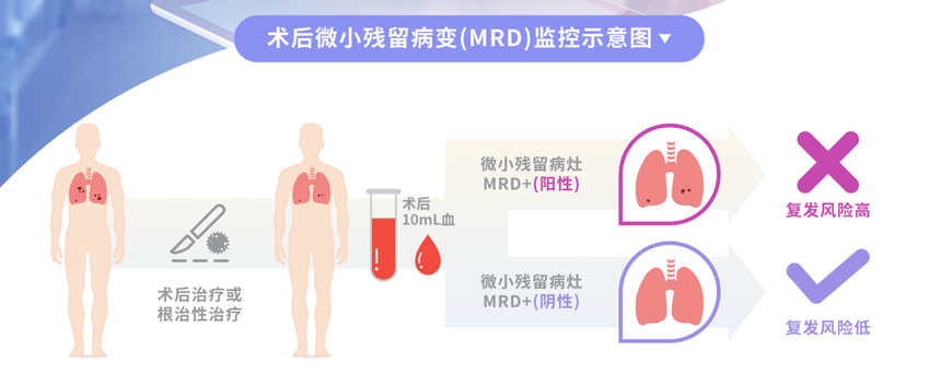 術(shù)后微小殘密病灶(MRD)監(jiān)控癌癥中的微小殘留病灶(Minimal Residual Disease,MRD)是指癌癥治療后仍存在于患者體內(nèi)、但影像學方法無法檢出的殘留腫瘤細胞或者微小病灶,屬于腫瘤進展的隱匿階段。殘留的癌細胞數(shù)量可能很少,暫時不會引起任何體征或癥狀,但它們可能導致未來腫瘤的進展或復發(fā)轉(zhuǎn)移,是腫瘤復發(fā)的直接原因。