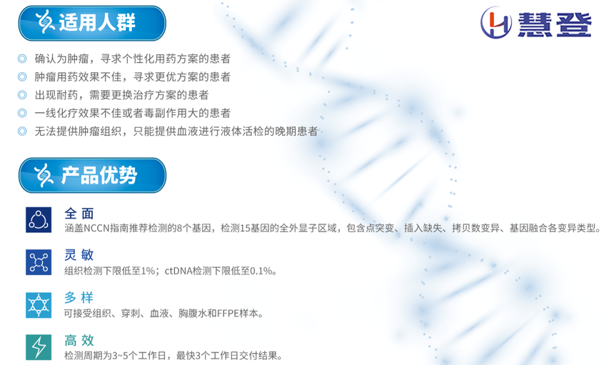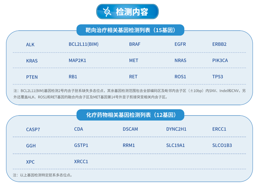 肺癌27基因檢測肺癌27基因產(chǎn)品采用高通量測序技術(shù),對15個肺癌靶向治療相關(guān)基因(包含NCCN推薦的8個基因)·及12個化療藥物相關(guān)基因特定多態(tài)位點進行高深度測序檢測,為臨床選擇治療藥物提供參考。 檢測的突變類型包括單堿基替換(SNV)、小片段插入缺失(Indel)、拷貝數(shù)變化(CNV)和部分基因重排(Fusion)。